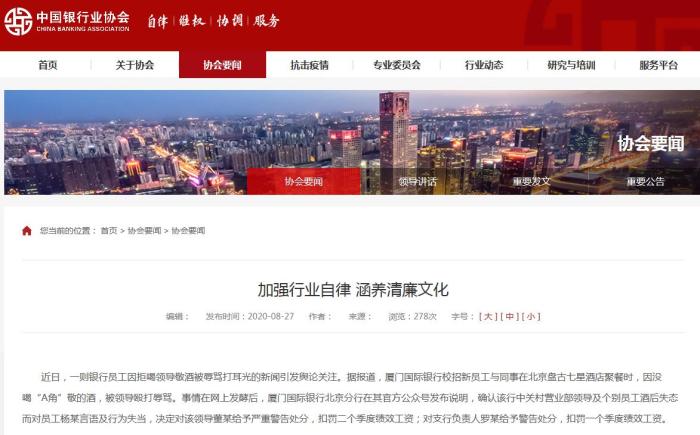 8月24日,廈門國際銀行北京分行發(fā)文證實此事并致歉。該行表示,員工楊某反映的中關(guān)村支行營業(yè)部某領(lǐng)導(dǎo)及該支行個別員工在私下非公款聚餐中,確系存在因酒后失態(tài)而對楊某做出言語及行為失當(dāng)?shù)扰e動,上述行為確實對其本人造成了影響和傷害,對此深表歉意。