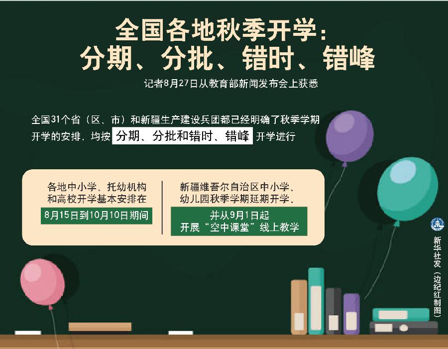 教育部應對新冠肺炎疫情工作領導小組辦公室主任、體育衛(wèi)生與藝術教育司司長王登峰介紹說,各地中小學、托幼機構和高校開學基本安排在8月15日到10月10日期間。新疆維吾爾自治區(qū)中小學、幼兒園秋季學期延期開學,并從9月1日起開展“空中課堂”線上教學。
