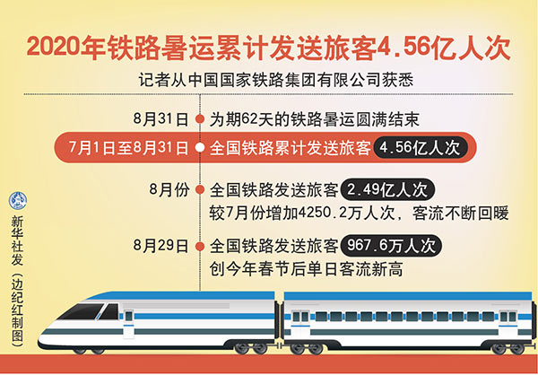 新華社北京9月1日電(記者樊曦)記者從中國國家鐵路集團有限公司獲悉,8月31日,為期62天的鐵路暑運圓滿結(jié)束。7月1日至8月31日,全國鐵路累計發(fā)送旅客4.56億人次。