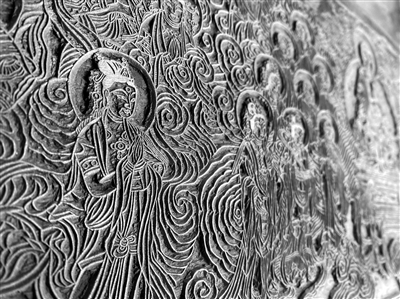 隨著白富鋼的五指輕盈地在古老的木板上游走,一塊木質經(jīng)板上縱橫的紋理逐漸明晰起來。這批經(jīng)板始刻于清雍正十一年(公元1733年),完成于清乾隆三年(公元1738年),是我國漢文大藏經(jīng)卷帙中收錄最豐富,也是最后一部官方雕印本。經(jīng)板共計79036塊,總重達400噸??胺Q我國木板經(jīng)書之最。
