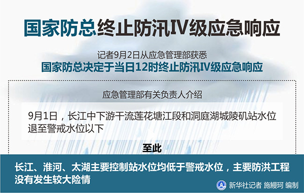 新華社北京9月2日電(記者劉夏村)記者2日從應(yīng)急管理部獲悉,國家防總決定于當(dāng)日12時終止防汛Ⅳ級應(yīng)急響應(yīng)。