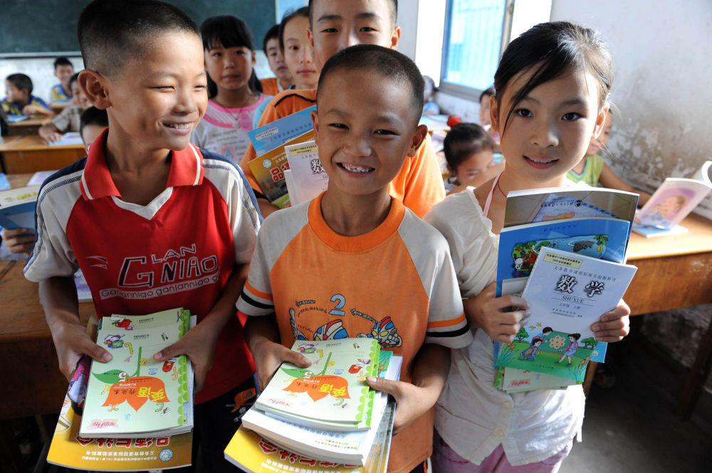 ↑ 這是2008年9月1日,江西樟樹(shù)市第二小學(xué)五(1)班鄧文俊(中)等同學(xué)領(lǐng)到免費(fèi)教科書(shū)。