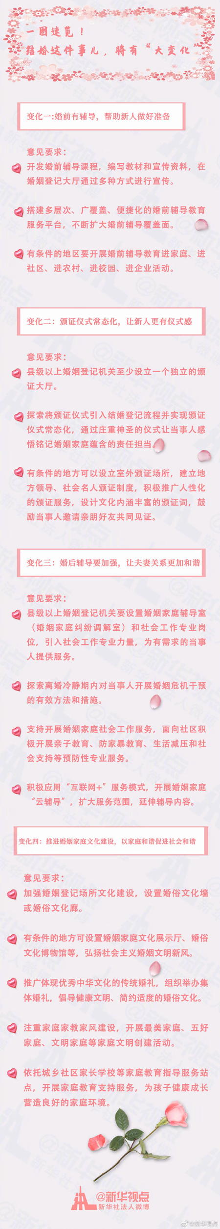 婚姻是家庭的紐帶,婚姻家庭和諧事關(guān)民生幸福和社會穩(wěn)定。意見要求,要探索開展婚前輔導(dǎo),開發(fā)婚前輔導(dǎo)課程,編寫教材和宣傳資料,在婚姻登記大廳通過宣傳欄、視頻、免費贈閱等方式進行宣傳,幫助當(dāng)事人做好進入婚姻狀態(tài)的準(zhǔn)備,學(xué)會管理婚姻,努力從源頭上減少婚姻家庭糾紛的產(chǎn)生。