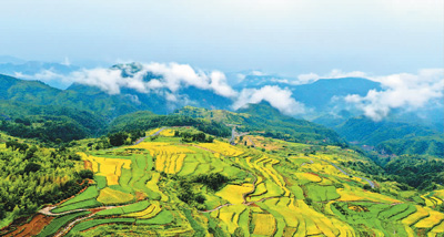 鳥(niǎo)瞰浙江省臺(tái)州市仙居縣朱溪鎮(zhèn)楊豐山金色梯田美景。 王華斌攝(人民圖片)