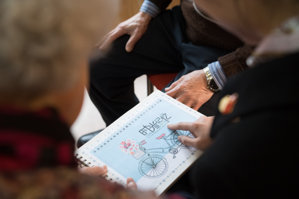 1月17日,杭州市社會(huì)福利中心“90后”朋友張丹俠(右)給83歲的王育華(左)送來(lái)她剛剛做好的相冊(cè)(翁忻旸/ 攝)