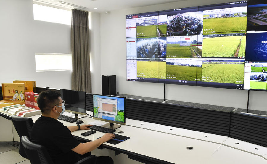 在吉林市昌邑區(qū)大荒地村,工作人員在東福米業(yè)現(xiàn)代農(nóng)業(yè)信息化監(jiān)視指控中心通過監(jiān)控系統(tǒng)查看稻田情況(8月13日攝)。新華社記者 許暢 攝
