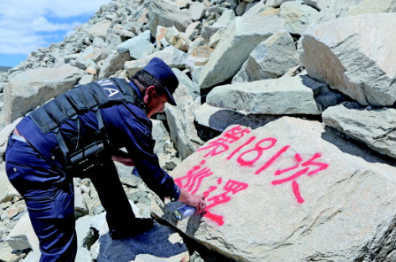 索朗達杰在崗布冰川巡邏時,在石塊上標記巡邏次數(shù)。 本報記者劉小草攝
