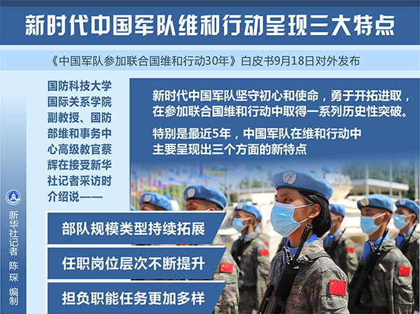 新華社北京9月18日電(記者黎云、張汨汨)《中國軍隊參加聯(lián)合國維和行動30年》白皮書18日對外發(fā)布。國防科技大學(xué)國際關(guān)系學(xué)院副教授、國防部維和事務(wù)中心高級教官蔡輝在接受新華社記者采訪時介紹說,新時代中國軍隊堅守初心和使命,勇于開拓進(jìn)取,在參加聯(lián)合國維和行動中取得一系列歷史性突破。特別是最近5年,中國軍隊在維和行動中主要呈現(xiàn)出三個方面的新特點(diǎn)。
