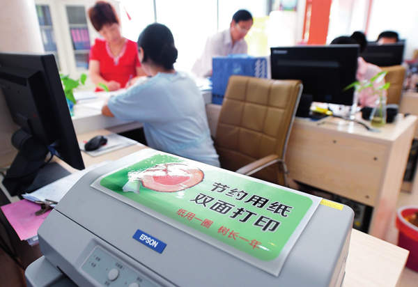 合肥市蜀山區(qū)文博苑社區(qū)的打印機(jī)貼著“節(jié)約用紙 雙面打印”的標(biāo)識(shí) 郭晨攝 / 本刊