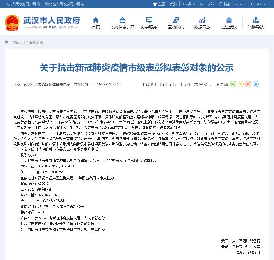 據(jù)武漢市人民政府網(wǎng)站消息,9月19日,武漢市抗擊新冠肺炎疫情表彰工作領(lǐng)導(dǎo)小組辦公室發(fā)布關(guān)于抗擊新冠肺炎疫情市級表彰擬表彰對象的公示,確定張鵬等870人為武漢市抗擊新冠肺炎疫情先進(jìn)個(gè)人擬表彰對象(含追授2人)。