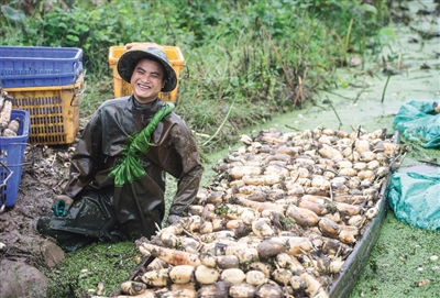 蓮藕是湖北省重要的特色農(nóng)產(chǎn)品。吳祺經(jīng)歷了蓮藕畝產(chǎn)從不足1000公斤到2000多公斤的跨越,也見(jiàn)證了從幾毛錢(qián)一公斤鮮藕到1元錢(qián)一小袋蓮藕制成品零食的增值?!斑@些影響賣(mài)相的‘邊角料’也有用,可以加工成藕粉?!彼闷饚坠?jié)被掰掉的藕頭說(shuō)。