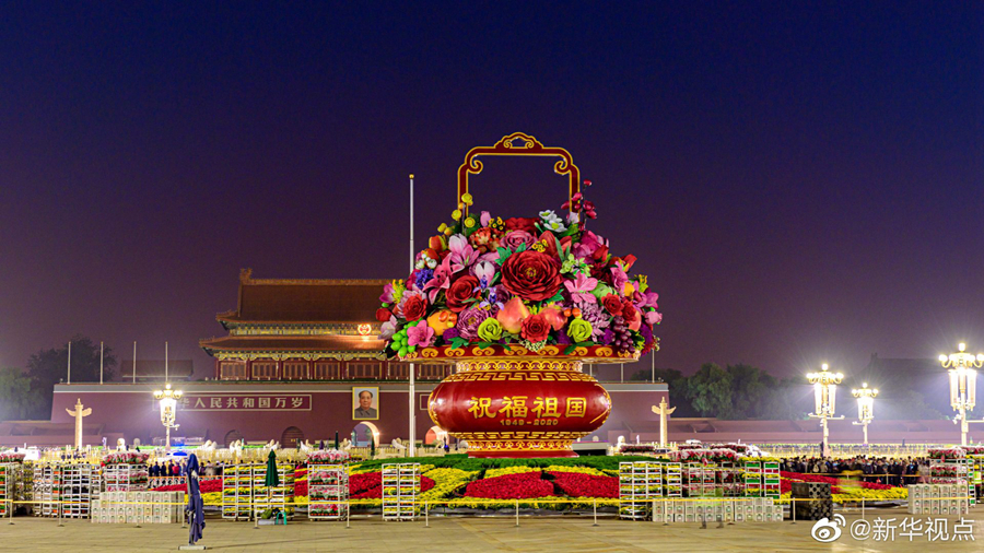 據(jù)悉,大花籃以喜慶的花果籃為主景,花籃為鋼架結構,籃身為玻璃鋼材質(zhì),籃盤直徑12米,花壇底部直徑45米。在籃體南側書寫“祝福祖國,1949-2020”字樣,在籃體北側書寫 “萬眾一心,1949-2020”字樣?;@內(nèi)共使用了125枝大型仿真花,籃底部花壇則使用我國自育花園小菊“絢秋星光”與一品紅組成10顆紅心的圖案。