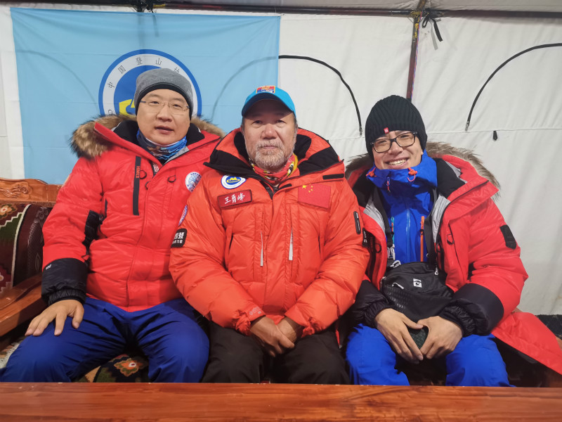 谷業(yè)凱(右)與中國登山隊隊長王勇峰(中)、人民日報記者袁泉(左)登頂前夜在珠峰大本營。