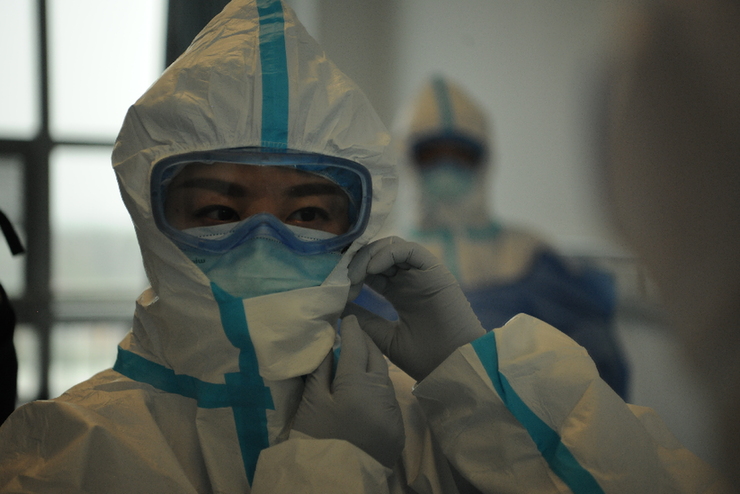 在華中科技大學(xué)同濟醫(yī)院光谷院區(qū)采訪,進重癥ICU前做好防護準(zhǔn)備