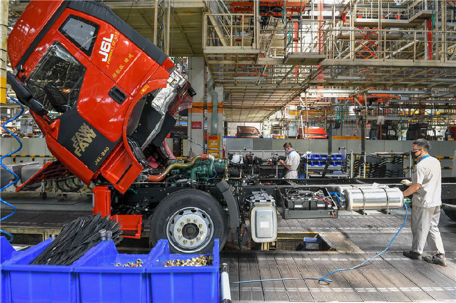 在位于長春的一汽解放總裝車間,工人在裝配車輛(6月19日攝)。新華社記者 張楠 攝
