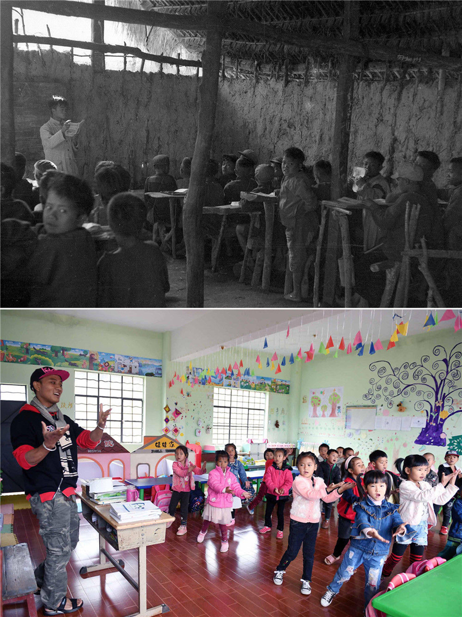拼版照片:上圖為1954年,在云南省普洱市西盟佤族自治縣創(chuàng)辦的第一所小學(xué)——西盟小學(xué),老師帶領(lǐng)孩子讀書學(xué)習(xí)(資料照片);下圖為2018年12月7日,云南省普洱市西盟佤族自治縣勐梭鎮(zhèn)班母村佤山育忠幼兒園的孩子跟著老師巖科上音樂課。1986年出生的巖科是班母村佤族寨人。他說,我的阿媽小時候沒有進(jìn)過一天學(xué)堂,現(xiàn)在,佤山的孩子們都在寬敞明亮的教室里學(xué)習(xí)(新華社記者楊宗友攝)。新華社發(fā)