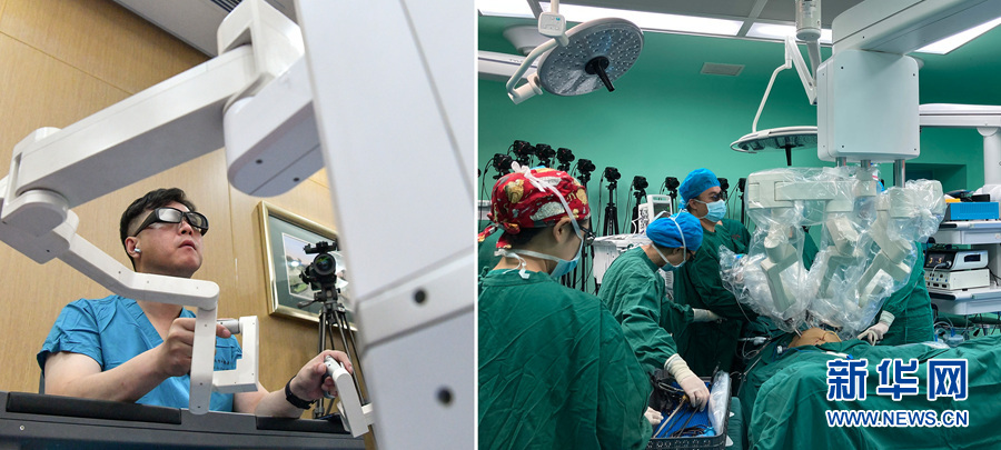 左圖:9月24日,在青島大學(xué)附屬醫(yī)院,醫(yī)院副院長、教授牛海濤使用新一代國產(chǎn)原研手術(shù)機(jī)器人——“妙手”為貴州省安順市的患者實施超遠(yuǎn)程手術(shù)。新華社記者 李賀 攝