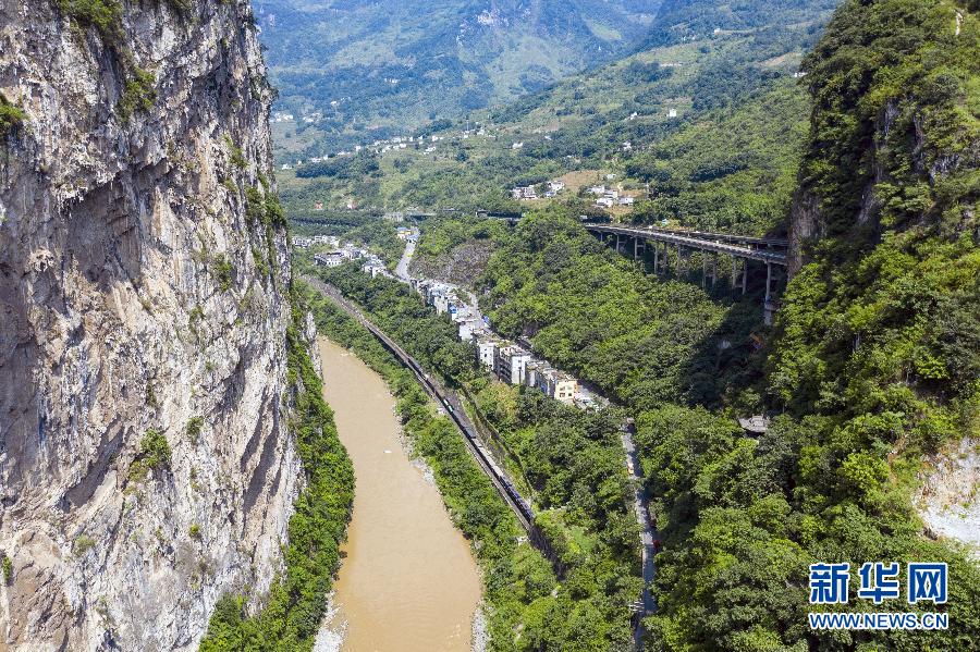 在云南省昭通市鹽津縣豆沙關(guān),五尺道、關(guān)河水道、內(nèi)昆鐵路、G247公路及G85渝昆高速5條不同時(shí)期的交通線路以幾乎并行的姿態(tài)呈現(xiàn)眼前(8月10日攝,無(wú)人機(jī)照片)。 新華社記者 江文耀 攝