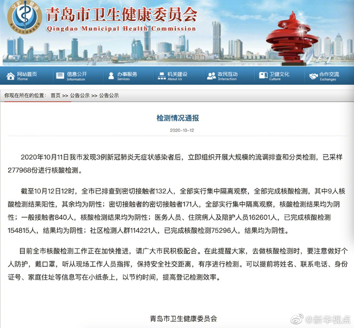 青島市衛(wèi)生健康委員會發(fā)布檢測情況通報稱,2020年10月11日我市發(fā)現3例新冠肺炎無癥狀感染者后,立即組織開展大規(guī)模的流調排查和分類檢測,已采樣277968份進行核酸檢測。