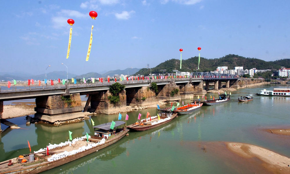 ↑ 廣濟(jì)橋中間的浮橋由十八只木船連接而成