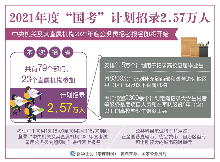 新華社北京10月14日電(記者林暉)記者14日從國(guó)家公務(wù)員局獲悉,中央機(jī)關(guān)及其直屬機(jī)構(gòu)2021年度公務(wù)員招考報(bào)名即將開始,本次招考共有79個(gè)部門、23個(gè)直屬機(jī)構(gòu)參加,計(jì)劃招錄2.57萬(wàn)人。
