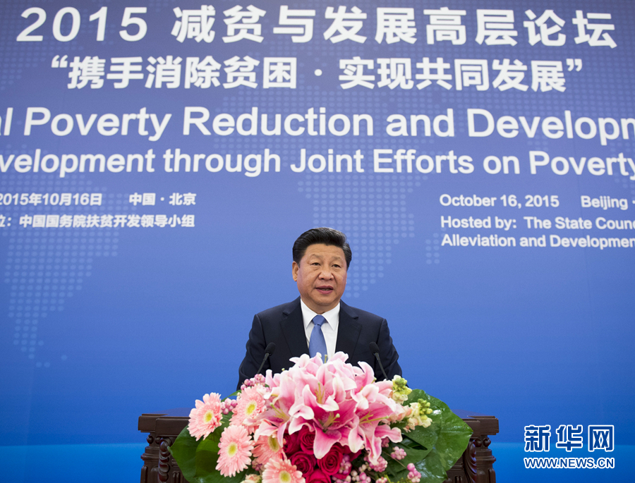 2015年10月16日,習(xí)近平在北京出席2015減貧與發(fā)展高層論壇并發(fā)表題為《攜手消除貧困 促進(jìn)共同發(fā)展》的主旨演講,強(qiáng)調(diào)消除貧困是人類的共同使命。改革開放30多年來,中國走出了一條中國特色減貧道路。中國在致力于自身消除貧困的同時(shí),積極展開南南合作,同舟共濟(jì),攻堅(jiān)克難,支持和幫助廣大發(fā)展中國家特別是最不發(fā)達(dá)國家消除貧困,為各國人民帶來更多福祉。 新華社記者 李學(xué)仁 攝