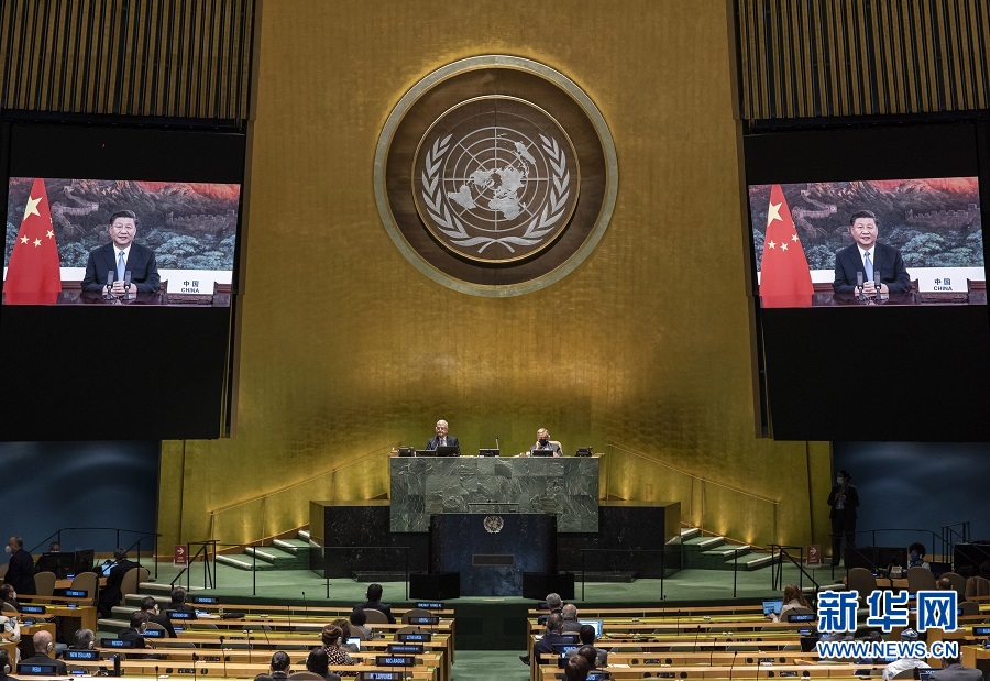 2020年9月22日,習(xí)近平在第七十五屆聯(lián)合國大會一般性辯論上發(fā)表重要講話,提出我們有信心如期實(shí)現(xiàn)現(xiàn)行標(biāo)準(zhǔn)下農(nóng)村貧困人口全部脫貧,提前10年實(shí)現(xiàn)《聯(lián)合國2030年可持續(xù)發(fā)展議程》減貧目標(biāo)。新華社發(fā)(聯(lián)合國供圖/埃瑟金德爾·德貝貝 攝)