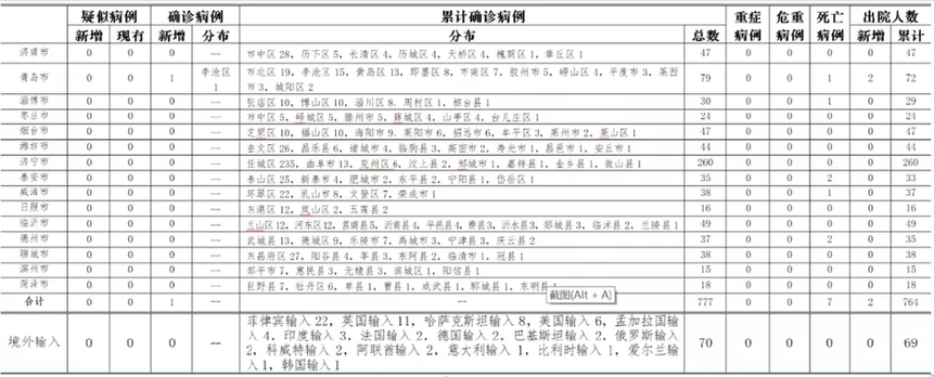 山東新增本地確診病例1例。累計(jì)報(bào)告確診病例777例,死亡7例。新增治愈出院病例2例,累計(jì)治愈出院764例。
