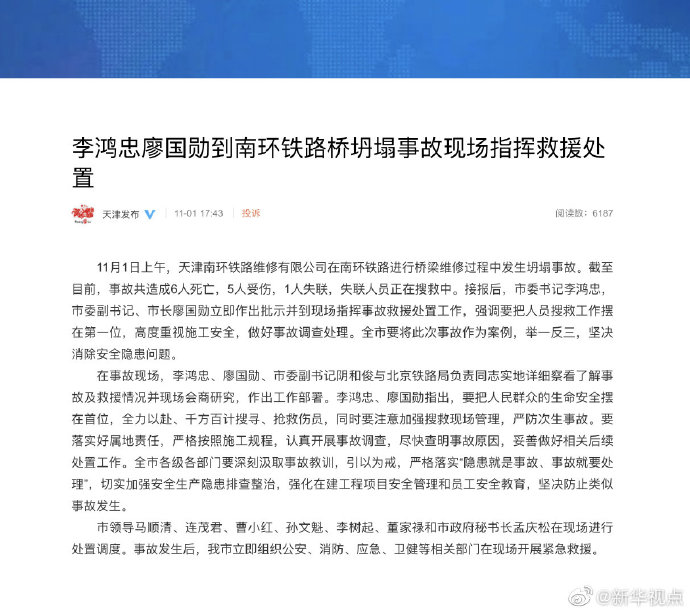 11月1日上午,天津南環(huán)鐵路維修有限公司在南環(huán)鐵路進(jìn)行橋梁維修過(guò)程中發(fā)生坍塌事故。截至目前,事故共造成6人死亡,5人受傷,1人失聯(lián),失聯(lián)人員正在搜救中。?