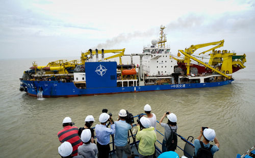 在江蘇啟東,“天鯤號(hào)”自航絞吸挖泥船駛離碼頭出港海試(2018年6月8日攝)。新華社記者 李響 攝