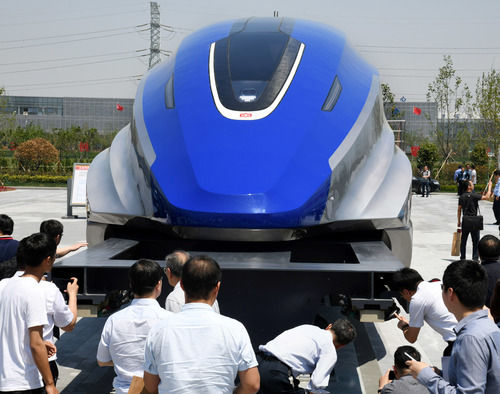 在山東青島,人們?cè)跁r(shí)速600公里高速磁浮試驗(yàn)樣車下線儀式上參觀(2019年5月23日攝)。新華社記者 李紫恒 攝