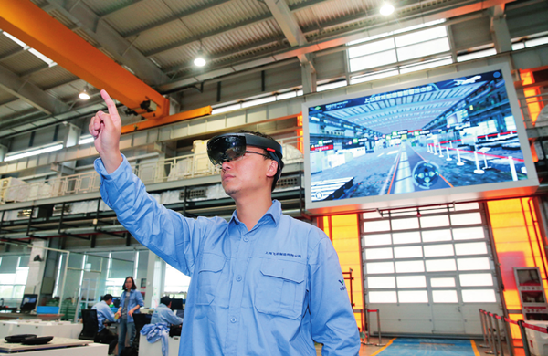 工作人員在中國(guó)商飛公司總裝制造中心智慧數(shù)控車間使用 AR 眼鏡操控虛擬電子屏幕(2018年5月5日攝)丁汀攝