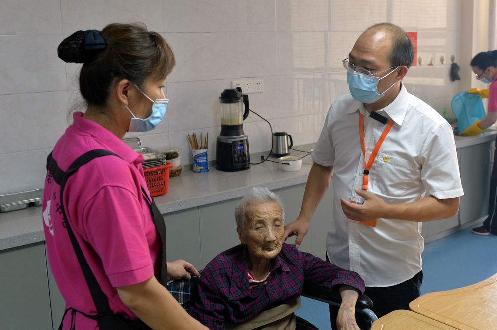 老年人能力評估師王帝權(右)在和護理人員交流老人的飲食狀況 新華社記者 戚曉毅 攝
