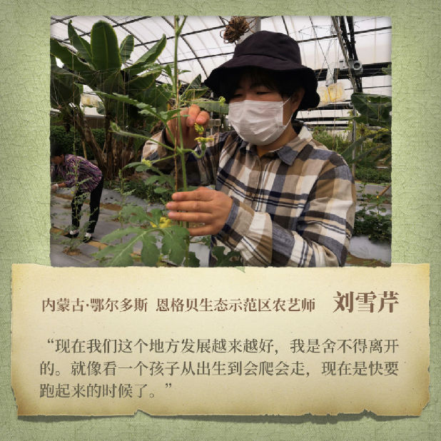 2009年初,大學(xué)畢業(yè)剛半年的劉雪芹來(lái)到恩格貝。彼時(shí),面對(duì)有技術(shù)門(mén)檻的設(shè)施農(nóng)業(yè),當(dāng)?shù)貛缀鯖](méi)有熟練工人,種植、育苗都需要?jiǎng)⒀┣凼职咽纸?。草業(yè)科學(xué)專(zhuān)業(yè)畢業(yè)的劉雪芹克服著環(huán)境、氣候等困難,同時(shí)也懂得借助自然的力量。