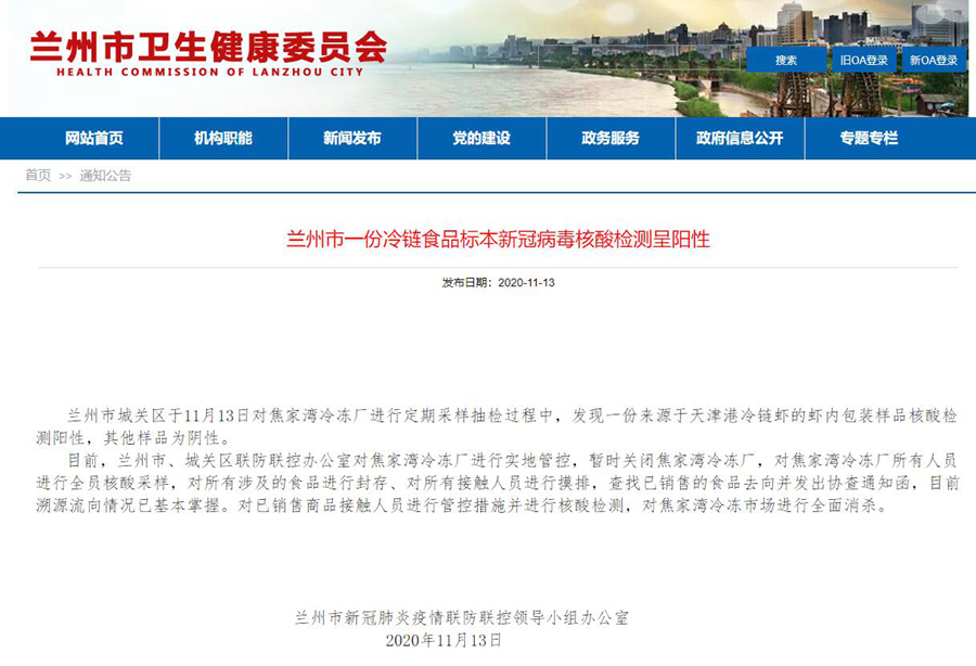 蘭州市城關區(qū)于11月13日對焦家灣冷凍廠進行定期采樣抽檢過程中,發(fā)現(xiàn)一份來源于天津港冷鏈蝦的蝦內包裝樣品核酸檢測陽性,其他樣品為陰性。