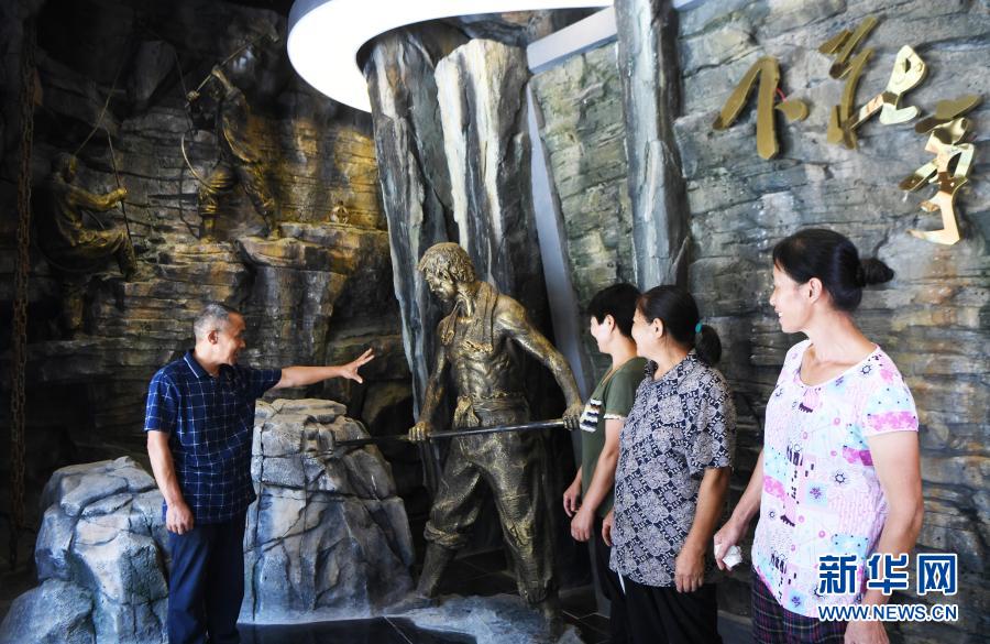 毛相林(右一)在下莊精神陳列館內講述當年修路的故事(2020年7月3日攝)。