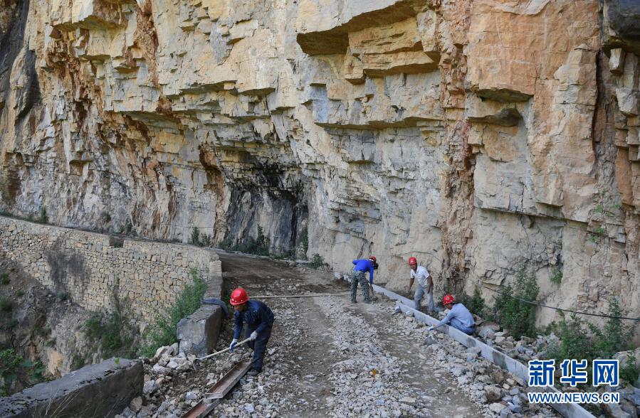 參與修路的下莊村村民在懸崖峭壁上打炮眼(資料照片)。