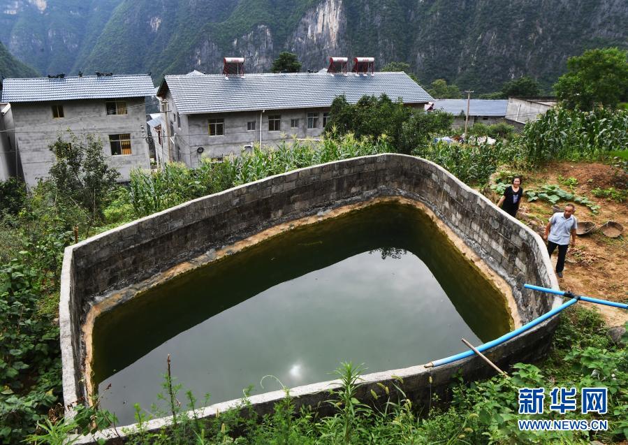毛相林(前)經過下莊村用于農業(yè)生產的水池(2020年7月3日攝)。