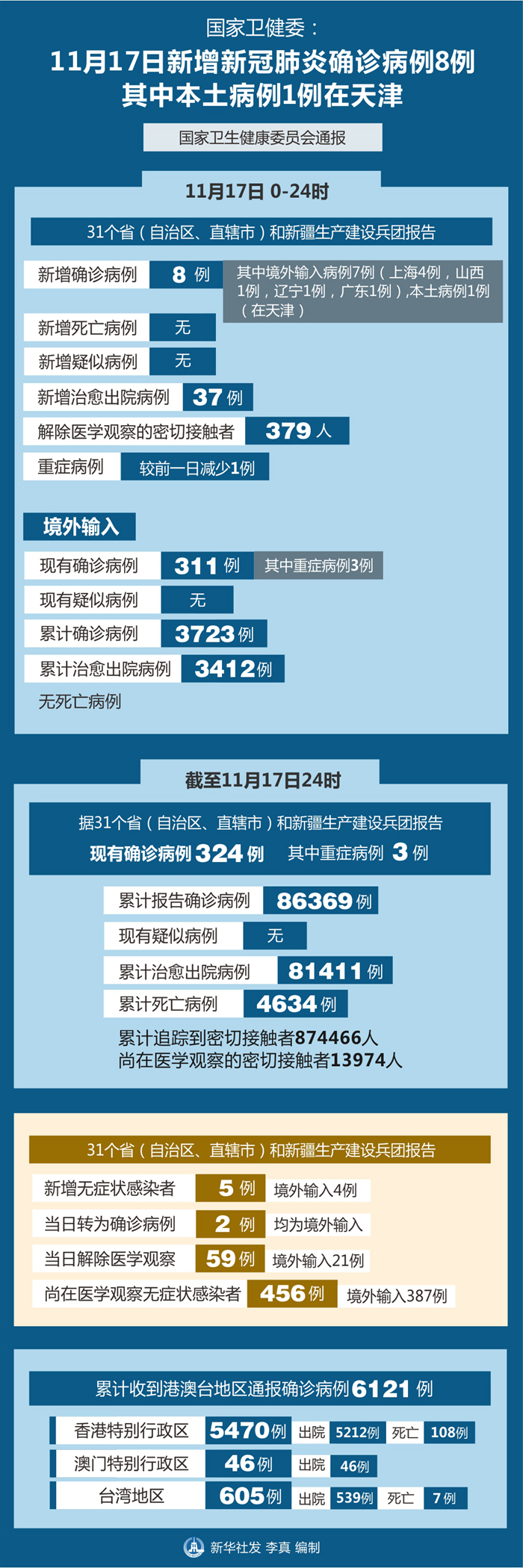 截至11月17日24時(shí),據(jù)31個(gè)?。ㄗ灾螀^(qū)、直轄市)和新疆生產(chǎn)建設(shè)兵團(tuán)報(bào)告,現(xiàn)有確診病例324例(其中重癥病例3例),累計(jì)治愈出院病例81411例,累計(jì)死亡病例4634例,累計(jì)報(bào)告確診病例86369例,無(wú)現(xiàn)有疑似病例。累計(jì)追蹤到密切接觸者874466人,尚在醫(yī)學(xué)觀察的密切接觸者13974人。