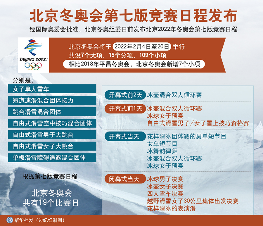 根據(jù)第七版競賽日程,北京冬奧會共有19個比賽日。最早的比賽是開幕式前2天進(jìn)行的冰壺混合雙人循環(huán)賽;開幕式前1天將舉行冰壺混合雙人循環(huán)賽、冰球女子預(yù)賽和自由式滑雪男子/女子雪上技巧資格賽;開幕式當(dāng)天將舉行花樣滑冰團(tuán)體賽的男單短節(jié)目、女單短節(jié)目和冰舞韻律舞,冰壺混合雙人循環(huán)賽和冰球女子預(yù)賽;閉幕式當(dāng)天將舉行冰球男子決賽、冰壺女子決賽、四人雪車決賽、越野滑雪女子30公里集體出發(fā)決賽以及花樣滑冰的表演滑。