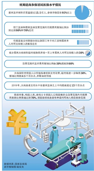 “實(shí)踐來看,經(jīng)基本醫(yī)保、大病保險(xiǎn)和醫(yī)療救助三重制度綜合保障,貧困人口住院費(fèi)用實(shí)際報(bào)銷水平穩(wěn)定在80%左右?!眹裔t(yī)保局稱。