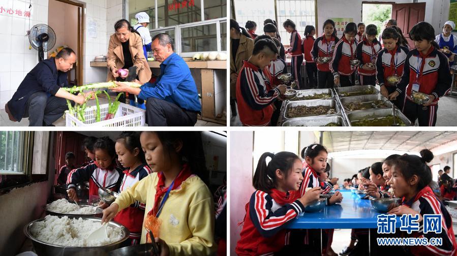 這是一張拼版照片。上左:在融水苗族自治縣東陽村小學(xué),廚房師傅們?cè)跍?zhǔn)備營養(yǎng)午餐;上右:東陽村小學(xué)學(xué)生根據(jù)需要挑選菜肴。下左:東陽村小學(xué)學(xué)生排隊(duì)打飯;下右:東陽村小學(xué)學(xué)生在食用營養(yǎng)午餐。近年來,廣西在貧困地區(qū)大力推行學(xué)生營養(yǎng)餐,幫助貧困學(xué)生健康成長(2019年5月6日攝)。新華社記者 張愛林 攝