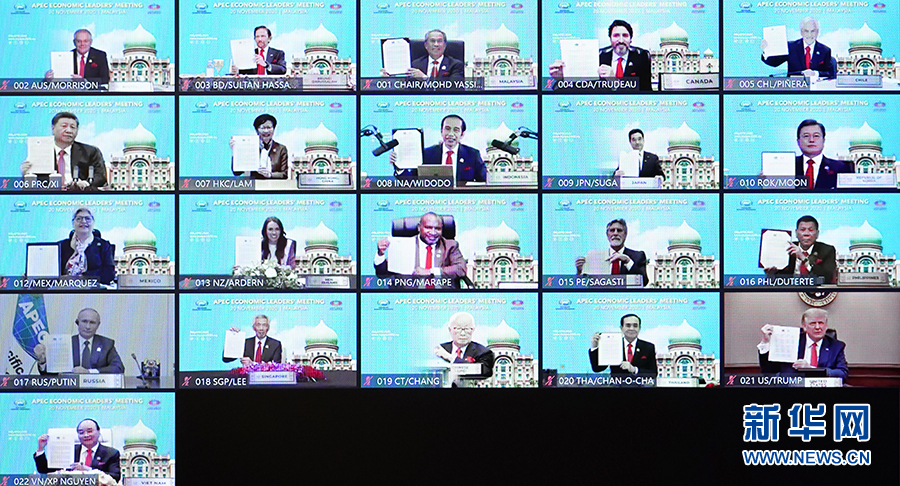 11月20日晚,國家主席習近平在北京以視頻方式出席亞太經合組織第二十七次領導人非正式會議并發(fā)表重要講話。這是與會各經濟體領導人、代表通過《2040年亞太經合組織布特拉加亞愿景》并線上合影。 新華社記者 李響 攝