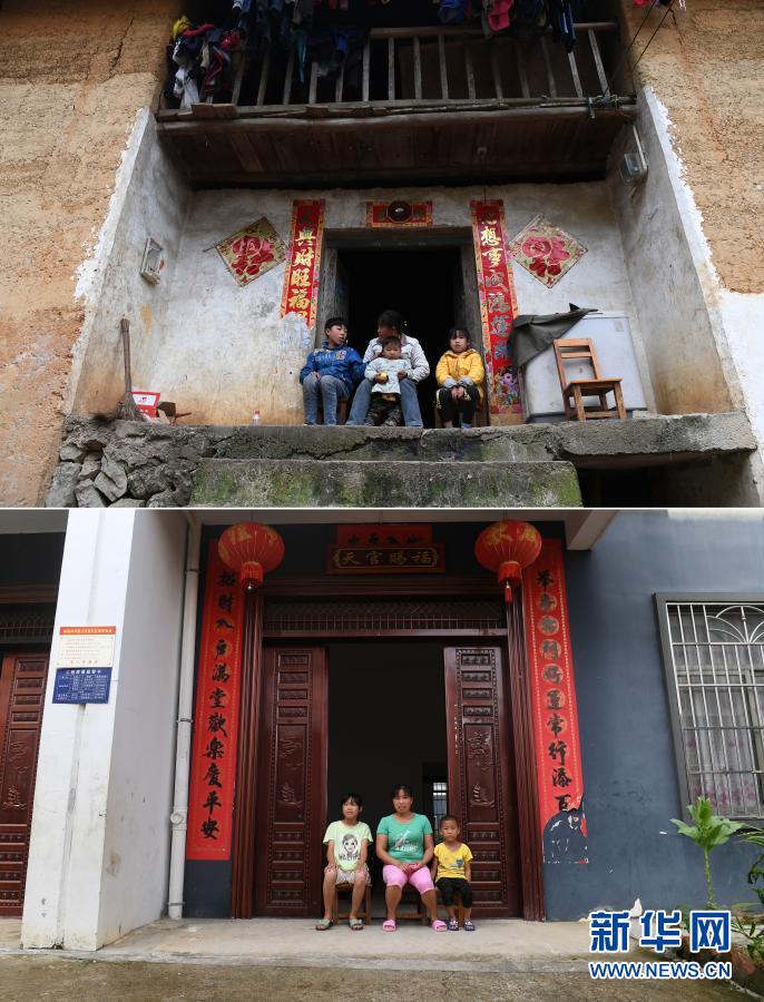這是一張拼版照片。上圖:在廣西都安瑤族自治縣下坳鎮(zhèn)加八村,白雨璐(右一)和家人坐在家門(mén)口(2017年2月9日攝);下圖:在下坳鎮(zhèn)車(chē)家莊扶貧搬遷安置新區(qū),白雨璐(左一)和家人坐在家門(mén)口(8月18日攝)。新華社記者 陸波岸 攝