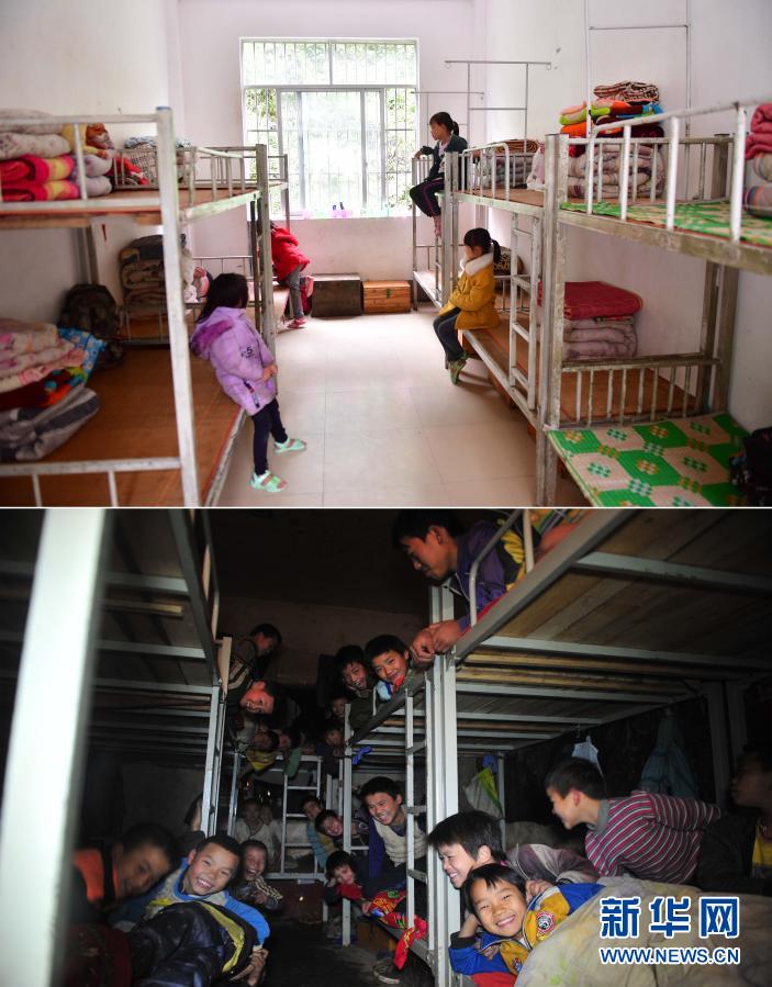 這是一張拼版照片。上圖:在大化瑤族自治縣板升鄉(xiāng)弄勇小學(xué),同學(xué)們?cè)谛滤奚崂铮?019年5月8日攝);下圖: 2012年12月26日,在弄勇小學(xué),同學(xué)們擠在10多平方米的“大通鋪”上準(zhǔn)備睡覺(jué)。新華社記者 黃孝邦 攝