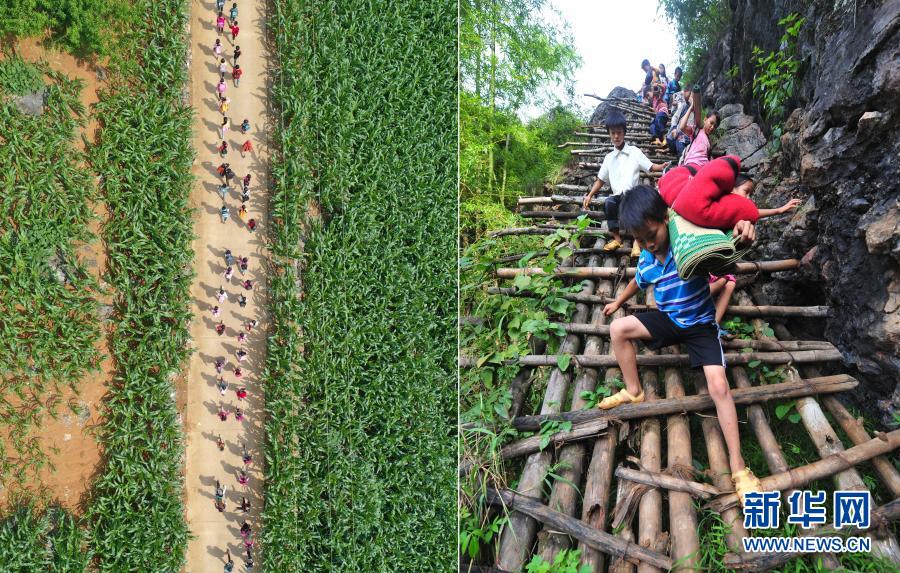 這是一張拼版照片。左圖:在大化瑤族自治縣板升鄉(xiāng)弄勇村,孩子們走在放學(xué)路上(2019年5月10日攝,無(wú)人機(jī)照片);右圖:在弄勇村弄頂屯,孩子們扛著生活用具,爬懸梯上學(xué)(2012年9月3日攝)。目前,弄勇村所有的屯都已告別沒(méi)有公路的歷史。新華社記者 黃孝邦 攝