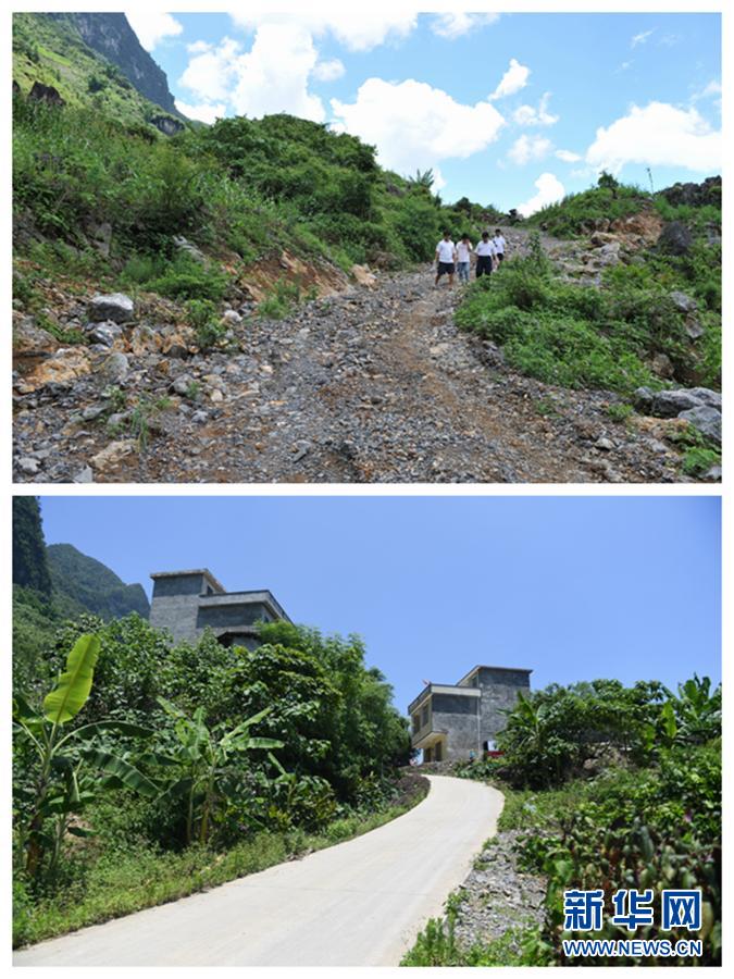 這是一張拼版照片:上圖:廣西那坡縣邊境零公里線上甲柳村上保屯的進(jìn)屯路(2009年7月14日攝);下圖:甲柳村上保屯現(xiàn)在的道路(2018年6月7日攝)。新華社記者 張愛(ài)林 攝