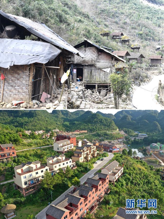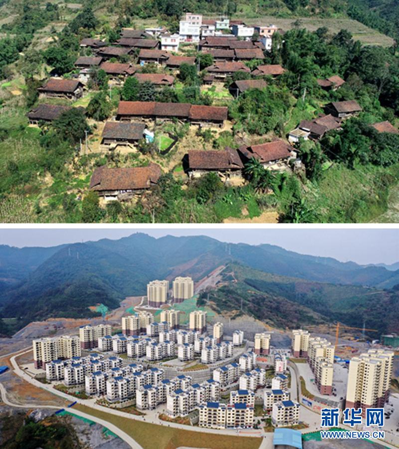 這是一張拼版照片。上圖:廣西百色市隆林各族自治縣金鐘山鄉(xiāng)平流村坡安屯群眾搬遷前的住房(2017年7月21日攝,無(wú)人機(jī)照片);下圖:平流村坡安屯群眾搬遷到安置點(diǎn)的新住房(2019年12月3日攝)。新華社記者 張愛(ài)林 攝