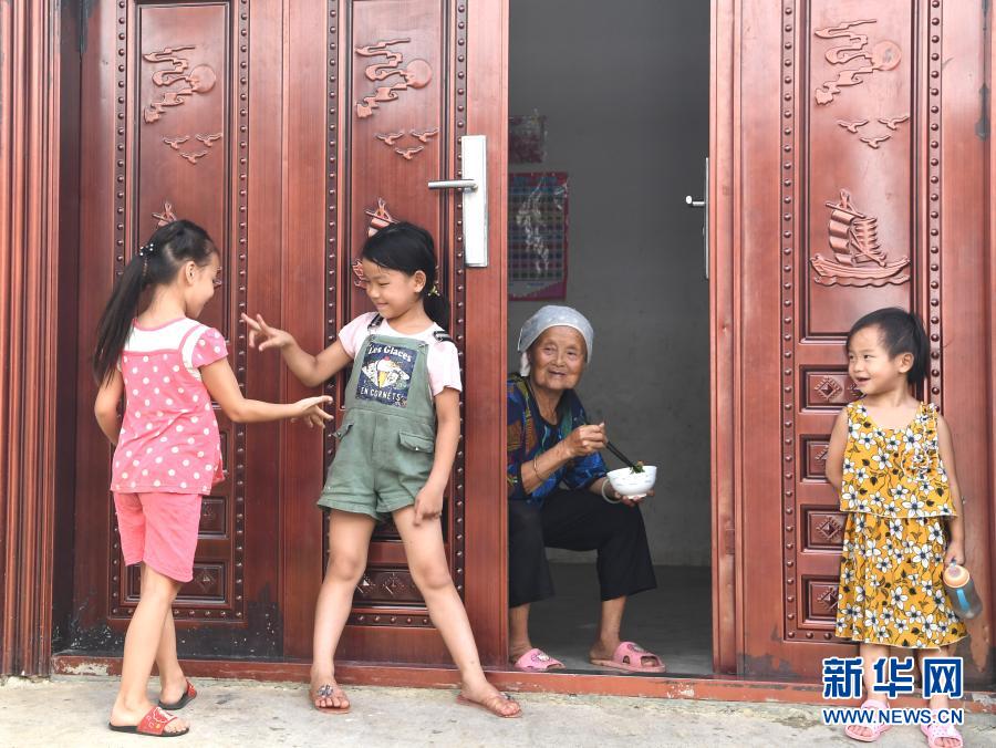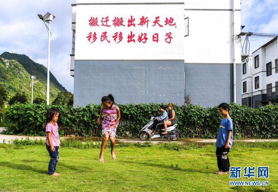 在廣西都安瑤族自治縣下坳鎮(zhèn)車(chē)家莊易地扶貧搬遷安置新區(qū),小朋友在玩耍(8月18日攝)。新華社記者 周華 攝