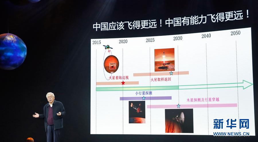 “這次嫦娥五號(hào)肩負(fù)著月球采樣返回的光榮使命,我們的天問(wèn)一號(hào)也正在飛向火星的路上,我們還要飛得更遠(yuǎn),去探測(cè)木星、小行星并建設(shè)我們的國(guó)際月球科研站。中國(guó)已經(jīng)昂首進(jìn)入了深空探測(cè)的新時(shí)代?!睔W陽(yáng)自遠(yuǎn)說(shuō)。